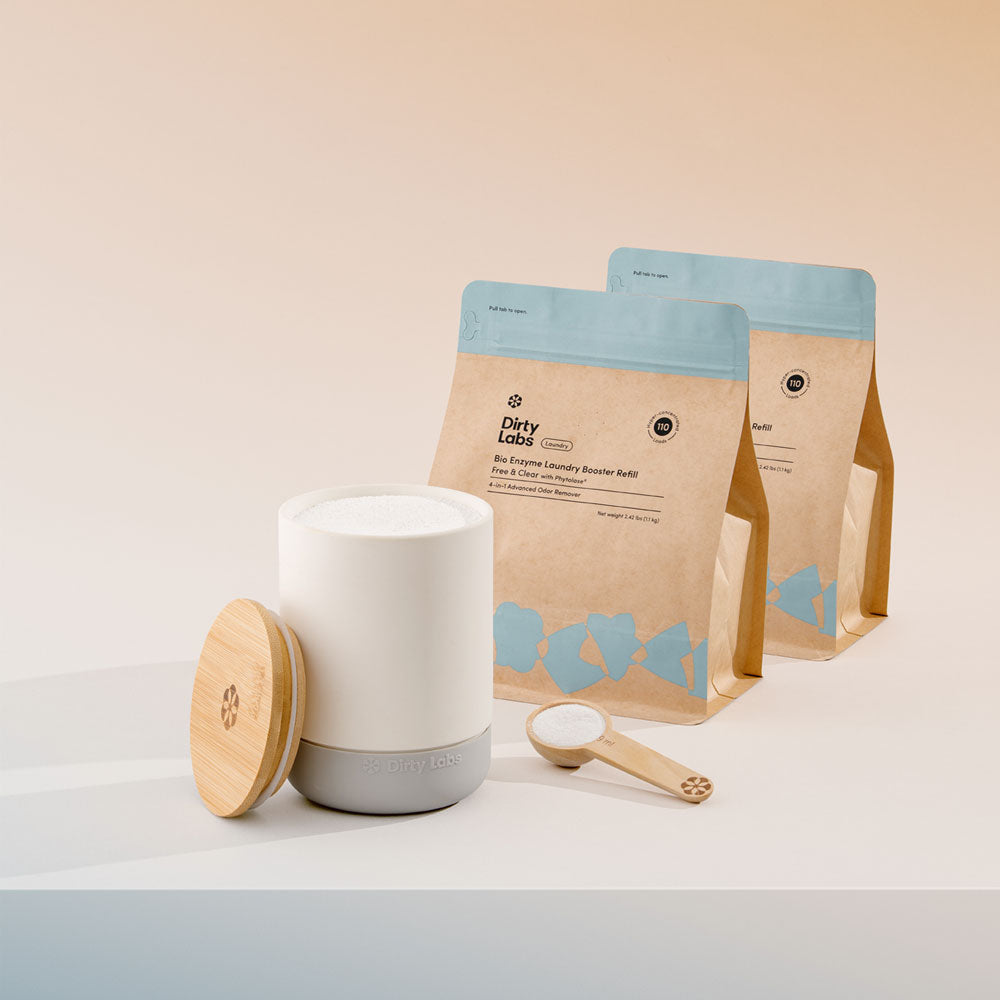 While our liquid detergents handle most stains really well, tough ones like (yellow pit stains, ring around the collar, weird grey or yellow stains on your favorite white sheets, and period stains) need extra help. Our Booster combines with our detergents, adding alkalinity and oxygen bleach for unmatched stain-fighting power and impeccable laundry results.