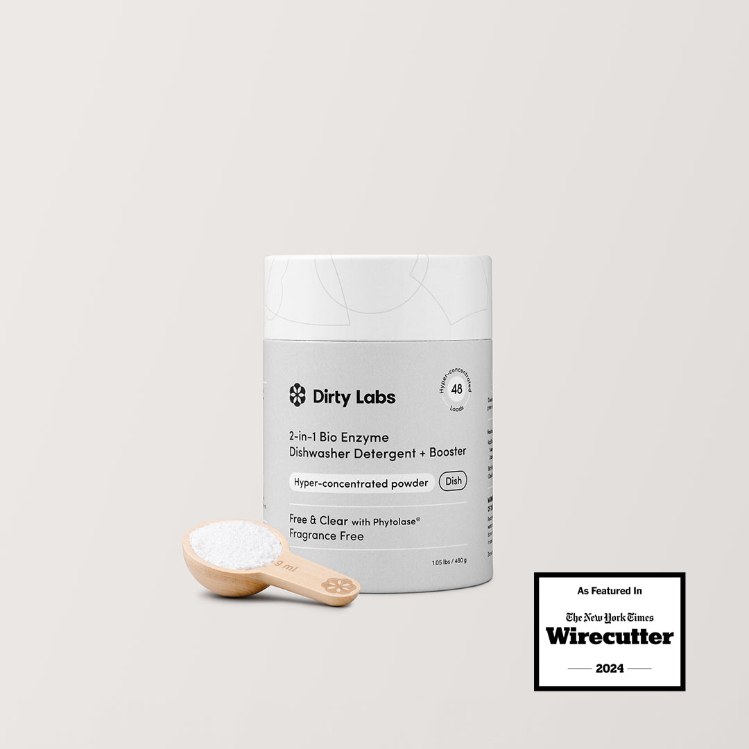 Dirty Labs dishwasher detergent container with a scoop of powder on a beige background - title: new packaging. same trusted formula.
