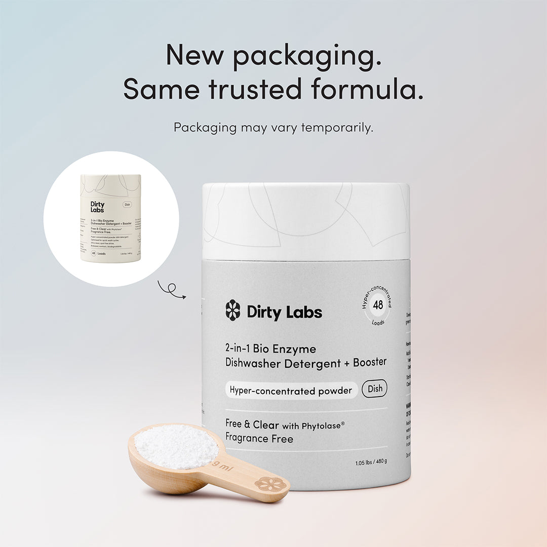 Dirty Labs dishwasher detergent container with a scoop of powder on a gradient background - title: new packaging. same trusted formula.